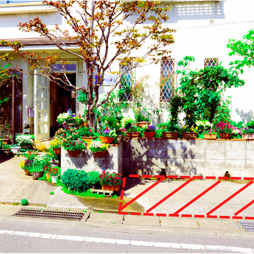 駐車場は2カ所あります。下の写真の赤枠内と近所のアパート住居の駐車場に駐車可能です(こちらは大きな車も駐車可能です。説明しづらいため、ご来店時にアパート駐車場の説明をさせていただきます)。